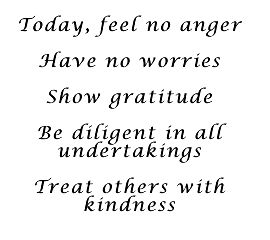 About the PreceptsThe Japanese language is written in kanji, each “word” represented by a character that can have different meanings given its context. Therefore each translation of the same material from Japanese to English can be done using quite different words; the essence, however, remains very much the same. Mikao Usui taught these Precepts to his Reiki students and instructed them to use them as described below. This particular version of the Precepts was translated directly from a copy written in Japanese by Mikao Usui. Dr. Tom Rimer, Chair of the Department of Far Eastern Studies at University of Pittsburgh made this translation at the request of Linda Keiser Mardis. I am very grateful to Linda for sharing this translation with me; it sings to me in a special way – I love the directness, simplicity, and clarity of Dr. Rimer’s translation. |